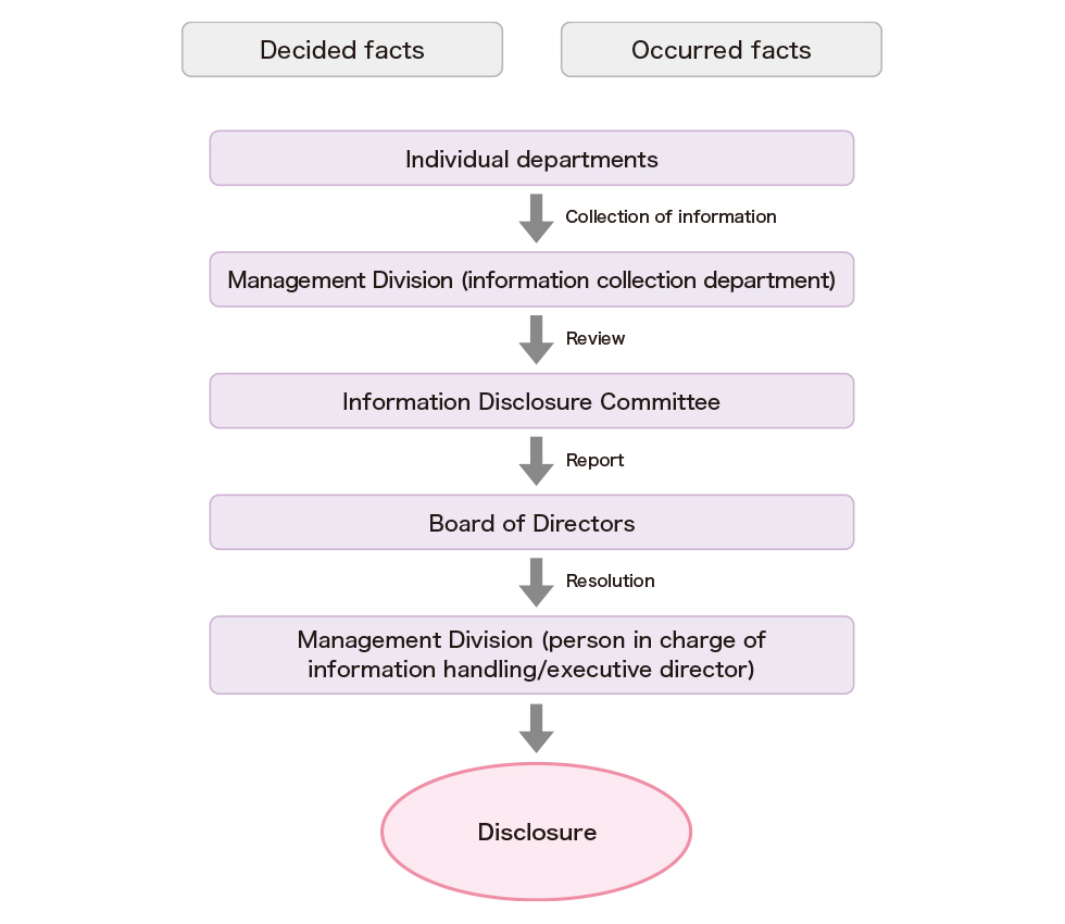 We will comply with the Financial Instruments and Exchange Act, the Timely Disclosure Rules of the Tokyo Stock Exchange, and other laws and regulations to practice timely and accurate information disclosure. We will do our best to ensure the fairness of the information we disclose via this website and different types of media. If any event that may affect our business performance occurs, we will make our best effort to promptly provide the information on the situation, our response policy, and the details of the impact on our business performance.