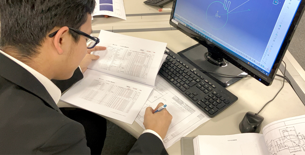 今、CATIA V5というCADの3Dソフトと、筆Rという製図の手書きの研修を受けています。もともと設計をしたかったので、どちらも得意な方ではあるものの、CADはこれまで使っていたソフトと違う種類なので、慣れない部分があり苦戦しています。正直、実際に配属先に行ったらどうなるかという不安もあります。 CATIA V5はわからないことが多いのですが、自分なりの解決策として、まず資料や教科書を読み、解決しない場合は近くに座っているCATIA V5が得意な同期に相談しています。それでもわからない時に研修担当者に聞きに行きます。ラーニングセンターの研修はお互いの席が近く、わからない時はすぐに振り向いて周りの人に聞くことができる環境です。 手書き製図の研修を行う中で研修担当者から、「作った図面を見て、その後に実際に作る人がいる。指示を誤ると時間が遅れたり、間違ったモノができるので細心の注意を払うように。」と言われました。大切なことなので心に留めて置きたいと思います。