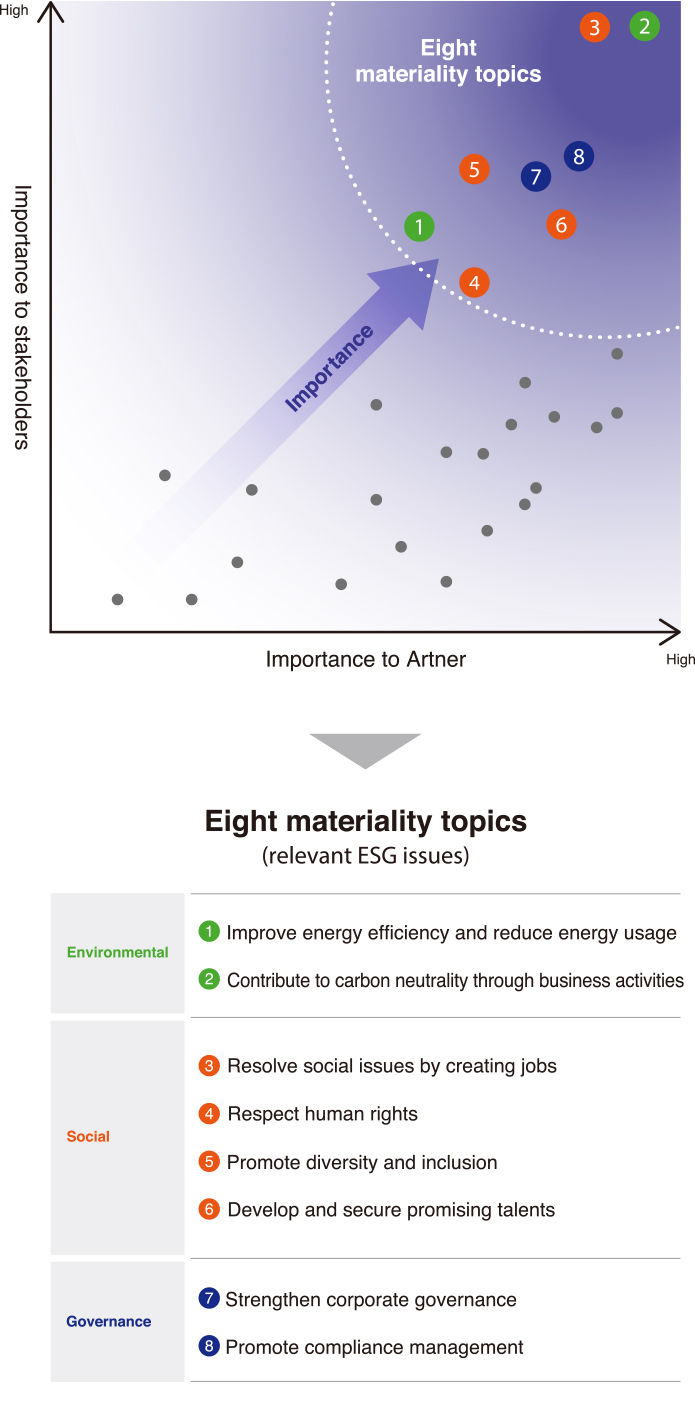 The identified issues were assessed by conducting internal and external stakeholder surveys in terms of their expectation and requirement levels for Artner, and then prioritized by two criteria: “importance to stakeholders” and “importance to Artner.”